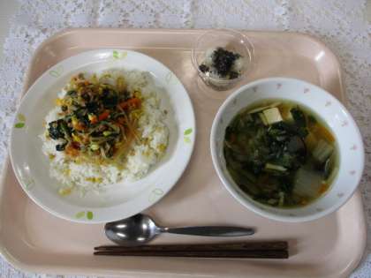 みそだれビビンバ 牛乳 もずく入り野菜スープ 黒ごま団子