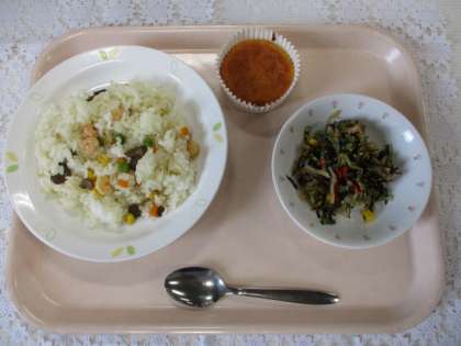 エビピラフ 牛乳 大根とひじきのサラダ かぼちゃのチーズケーキ