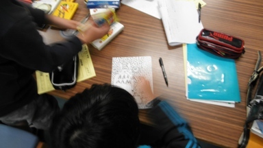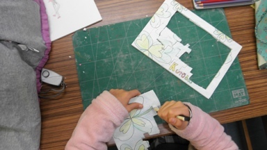漫画絵を描いたボードを切って、ジグソーパズルを作っている様子です。ハンカチの漫画をモチーフにしたそうです。