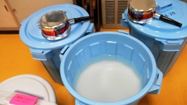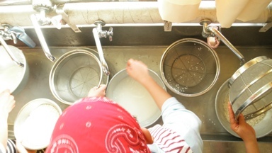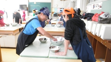 もちつきの前日は60kg以上のもち米を洗います。洗うのは6年生全員です。冷たい水で、もち米にあった洗い方で手際よく進めます。また、準備のためPTA役員の皆さんに朝早くから対応していただきました。ありがとうございました。
