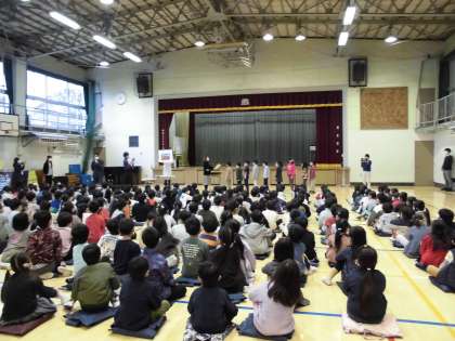 今日の朝会では、1・2年生春の消防写生会での