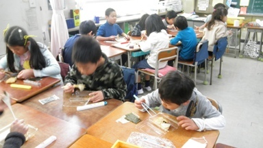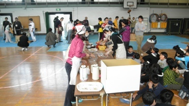 つきあがったおもちは、PTAの皆さんが手際よく丸めてくださいます。そして、子どもたちのもとへ届けられます。子どもたちは、自分たちもついたつきたてならではのやわらかいおもちを一心不乱に食べていました。