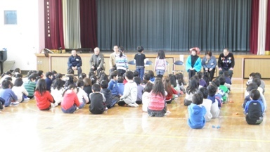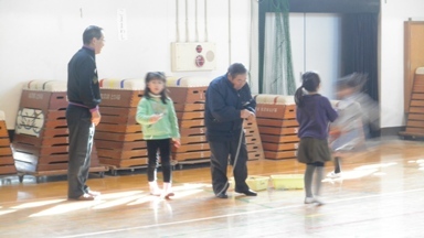 1年生が寿会の皆さんと昔遊びをしたり一緒に給食を食べたりして交流しました。寒い体育館でしたが、子どもたちは喜々として遊んでいました。昔遊びのやり方やこつさえつかめば、もっと流行りそうな気がします。また、運動感覚や手先の器用さを育てることにもつながります。