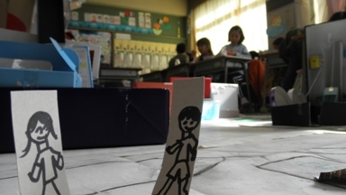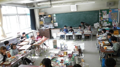 1年3組が図工で作った「ゆめのまちさんちょうめ」の作品を教室の真ん中に置き、それを囲んで給食を食べていました。細かいところにもこだわりがあり、作品にはいっぱいの愛着があるのでしょう。満足いっぱいの顔で給食を食べていました。