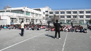 今月の避難訓練は、学校内に不審な人が侵入してきた場合の訓練です。子どもたちは、不審者の身柄が確保されるまでは、声を出さず姿を現さず教室の出入り口を封鎖します。その後、身柄を確保したとの放送を受け、校庭に避難します。いつもと違う緊張感がありました。