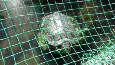 寒い日は、ずっと水中で眠っているカメさんたちですが、今日のような暖かい日は日向ぼっこをしに出てきます。よく観察すると寝起きのような顔をしています。