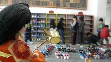 1年生が靴箱に入っている靴を段ごとに並べて、分からなくならないようにしながら掃除をしていました。グループで手際よく声をかけあって掃除を進めていくその様子に、感心してみていました。