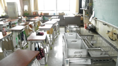 給食では6年生が1年生から5年生までの各学級の招待を受けて一緒に給食を食べました。下級生の学級に入ると、ひと際大きく見えます。