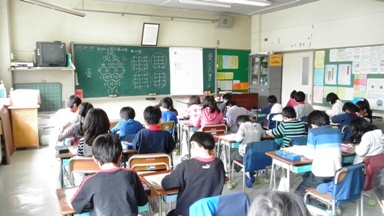 2年2組の算数の授業の様子です。活気と秩序のある学習風景です。窓側にある作品が子どもたちをやさしく見守っているように見えました。