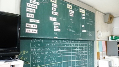 5年1組の家庭科の授業の様子です。片付けまでの調理手順を確認しながら、グループで協力して作ります。自分で作った出来たては、☆☆☆分のおいしさです。
