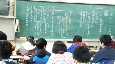 5年3組の教室では、大造じいさんとガンの学習をしていました。この作品は、椋鳩十先生の傑作です。ワークシートを活用しながら、残雪の行動や大造じいさんの心情を読み取りながら、読み深めていく授業です。授業の足跡は、黒板をみるとよく分かります。