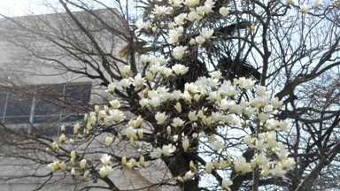 ようやく校庭のA昇降口近くにある白モクレンが、昨年よりも10日近く遅れて開花しました。白モクレンが咲くと桜の開花もすぐです。今年は、桜の入学式になりそうです。