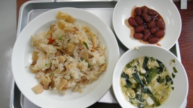 たけのこご飯、かきたま汁、煮豆(うずら豆)、牛乳