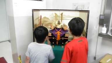 端午の節句の季節になるとA昇降口に兜を展示します。それを見ている男の子たちの会話では、「この剣、抜けるかな。」、「この弓矢、使えるのかな。」です。兜は話題になりません。興味があるのはその両脇にある武器でした。