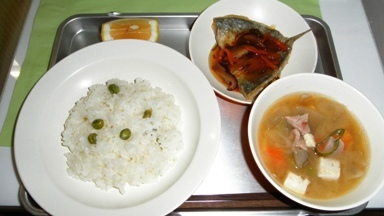 グリンピースご飯、魚の甘酢あんかけ、豚汁、くだもの(美生柑)、牛乳
