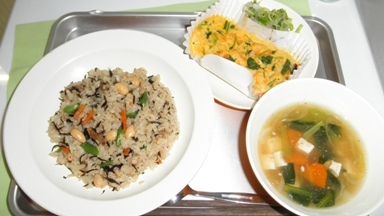 豆入りひじきご飯、卵焼き、キャベツのゆかりかけ、豆腐汁、牛乳
