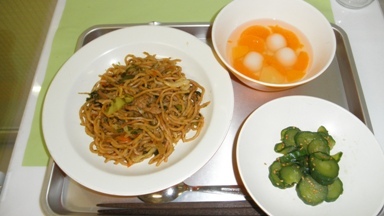 ソース焼きそば、きゅうりの中華味、フルーツ白玉、牛乳