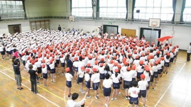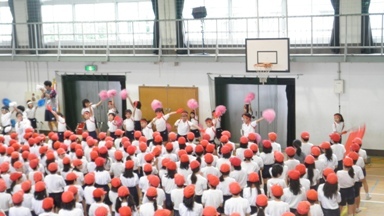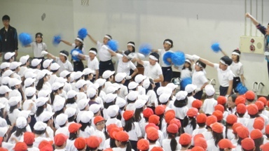 寒い一日となりました。あいにくの天気のため、体育館で全体練習です。整理運動の練習をし、閉会式では、優勝したときの練習を赤組も白組もしました。その後は、午後のプログラムの応援練習です。