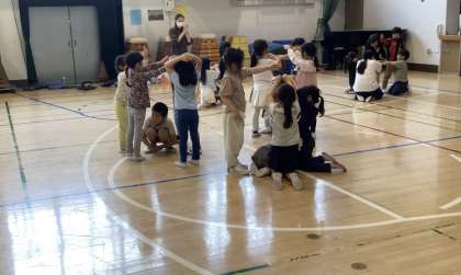 1年生は、クラスごとに先週と今週の2回に分けて、パブリックシアターを体験しました。楽しく体を動かして絵や物を表現しました。