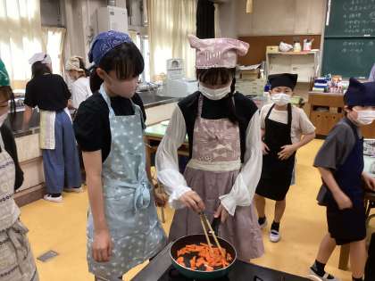 調理実習を行いました。短時間で調理ができ、栄養バランスよい朝食作りをしました。人参を火が通りやすいように薄く切るなどの工夫をしていました。