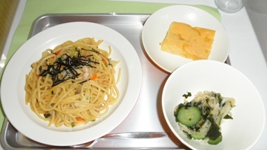 玉ネギ・・・和風スパゲッティの中に入っている玉ネギは、ネギと同じユリ科の仲間です。玉ねぎは、野菜の中で最も糖質が多く、そのほとんどがエネルギー源として使われ、疲労回復の役割を果たします。玉ネギには、辛みと刺激の正体である「硫化アリル」という成分が豊富に含まれています。この硫化アリルは、血液をサラサラにし、動脈硬化の原因となる血栓やコレストロールの代謝を促進し、血栓をできにくくする作用があります。高血圧、糖尿病、脳血栓、脳梗塞などの生活習慣病の予防に効果的です。このように玉ネギは、いろいろな効果があるので、残さず食べましょう。