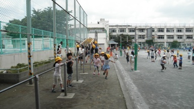 運動会が終わり、学校生活にもだいぶ慣れてきた1年生。学校のいろいろ場所で見かけるようになりました。カメの池や鉄棒・ジャングルジムには、多くの1年生が集まります。人気のスポットです。