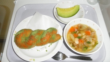 ケロケロ揚げパン(うぐいすきな粉)、白インゲンの田舎風スープ、メロン、牛乳