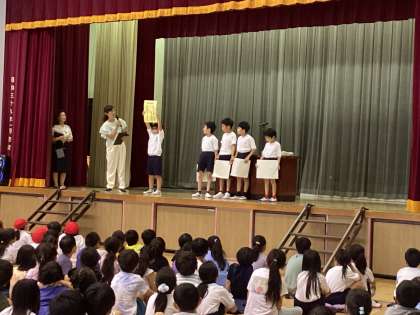 2学期が始まって、初めの全校朝会がありました。「9月のめあて」について、2年生の数名が登壇し、紹介してくれました。