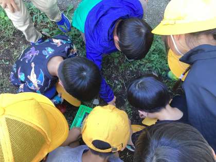 虫みつけに瀬田中学校に行きました。子供達は、見つけたバッタや、トカゲなどを捕まえようとしました。