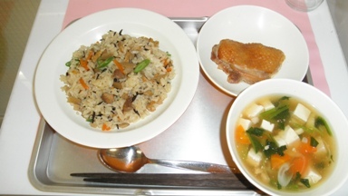 五目御飯、鶏肉の照り焼き、豆腐汁、牛乳
