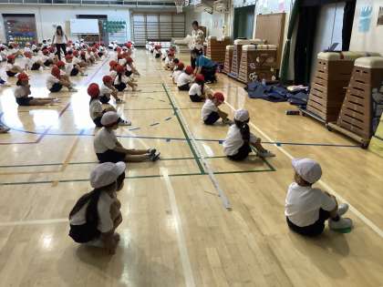 今日の体育館で瀬田スポの練習をしました。体系移動の練習をして、綺麗に並べました。