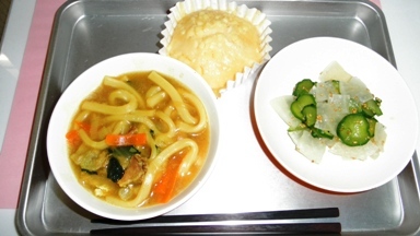 カレーうどん、チーズ入り蒸しパン、キュウリと大根のごま風味、牛乳