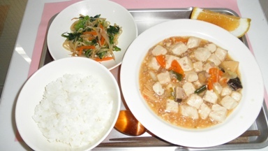 ご飯、西湖豆腐、ナムル、美生柑、牛乳