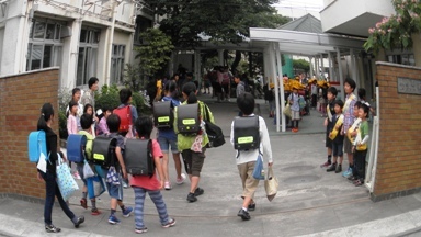 雨が降りそうな天気でしたが、なんとか天気はもちました。今週のあいさつ当番は、6年2組と1年2組です。6年と1年のコンビになると学年ごとにならず混じってのほほえましいあいさつとなります。