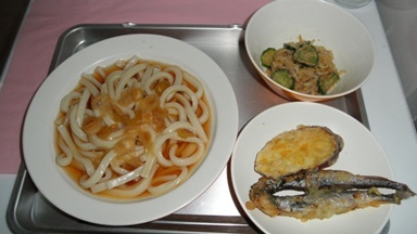 冷やしつけめん、天ぷら(サツマイモ、シシャモ)、ごま酢かけ、牛乳