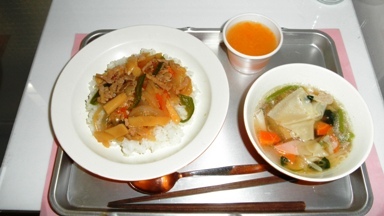 スタミナ丼、ワンタンスープ、フルーツゼリー、牛乳