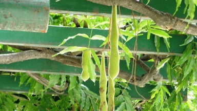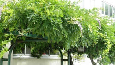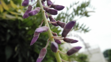 B昇降口近くにある藤の木が開花し始めました。マメ科の植物らしい実がついています。