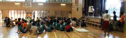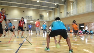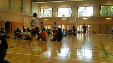 長期休業日になると先生たちは、普段子どもたちが登校するときには、なかなかできないことをします。研修会もその一つです。画像は、7ブロック8校の小学校の先生たちが集まって、安全に楽しく運動をするための研修をしているところです。子ども役になって、運動の特性やこつ、ルールの工夫や安全などについて研修を深めていきます。
