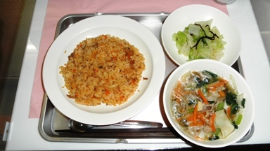 キムタクご飯、ワンタンスープ、キャベツの塩こんぶかけ、牛乳