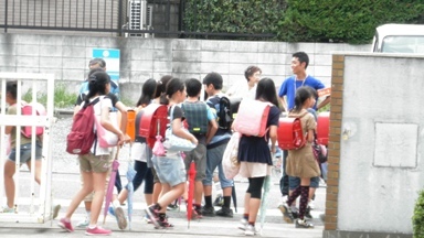 一斉下校は、全学年が同じ時間に一斉に下校します。今日は全学年が3時間授業ですので、一斉下校としました。学級単位で校庭に集合し(雨天の場合は別)、担任が人数確認をした後、子どもたちは下校します。先生たちは、瀬田中交差点、瀬田交差点、五差路に分かれて、下校指導をします。