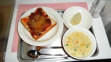ピザトースト、クリームスープ、ナシ、牛乳