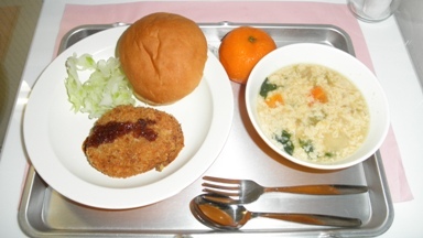 丸パン、コロッケ、ボイルキャベツ、チーズのふわふわスープ、冷凍ミカン、牛乳
