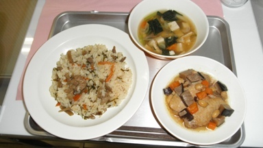 豚肉とゴボウのご飯、吉野汁、大豆と手羽のやわらか煮、牛乳