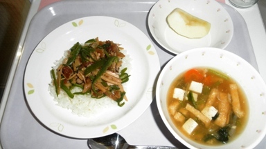 チンジャオロース丼、豆腐汁、リンゴ、牛乳