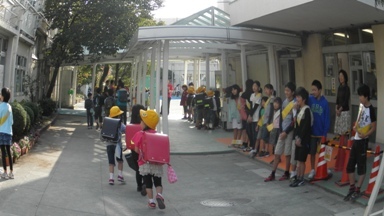 今週のあいさつ運動は6年1組と1年1組がしています。ただ、6年生は明日から連合運動会に向けて朝練習が始まるため、今日は多くの6年1組の子があいさつ運動に参加していました。