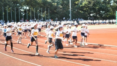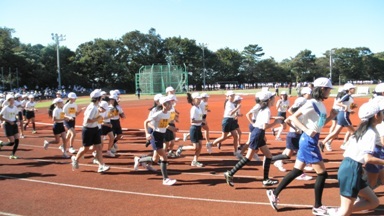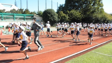 秋晴れの心地よい天気の中、世田谷区立小学校Bグループ(22校参加)の連合運動会がありました。開会式の後、準備運動をし、陸上専用トラックを軽くランニングをしてグランドの感触を確かめます。