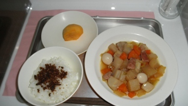 ご飯、ふりかけ、豚肉と大根の旨煮、柿、牛乳