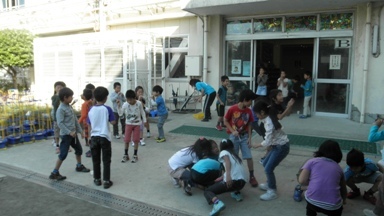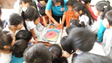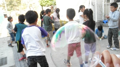 2年生の図工の授業の様子です。シャボン玉で遊んだ後、シャボン玉のイメージをマー部リングを使って表現します。子どもたちはのりのりでした。