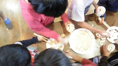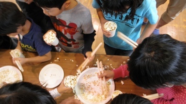 最後に自分が作ったお箸でポップコーンなどのお菓子をつまんで紙コップに入れます。機能的に優れているお箸はつまみやすく、遊び感覚でお箸の作り具合を確かめることができます。子どもたちに感想を聞くと、家に帰ったらさらにやすりでみがいて完成させたいという声が聞かれました。今日参加した子どもたちは、家に帰ったら、お箸の形に隠された秘密をあばくためにつぶさに観察することでしょう。