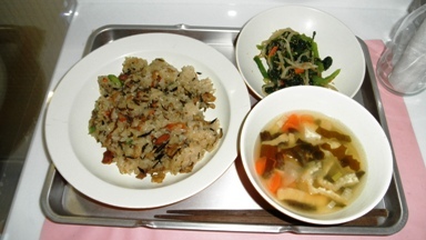 磯おこわ、みそ汁、野菜のごまだれかけ、牛乳